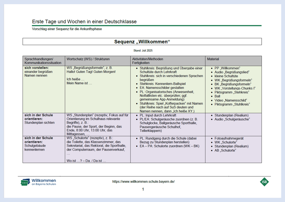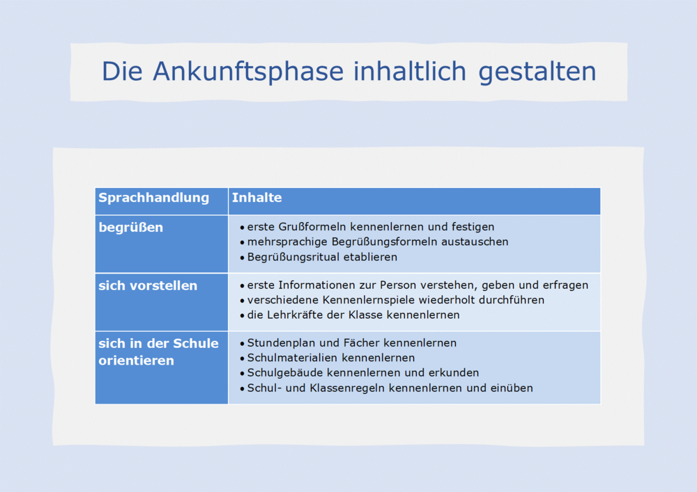 Wichtige erste Sprachhandlungen sind „einander begrüßen” und „sich vorstellen”. Darüber hinaus benötigen die Schülerinnen und Schüler Zeit und Gelegenheit, sich in der Schule und im Schulalltag zu orientieren.